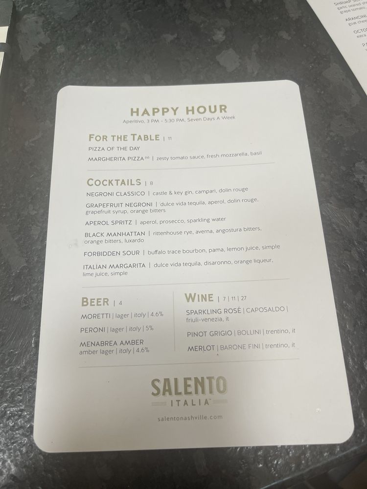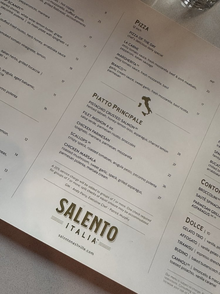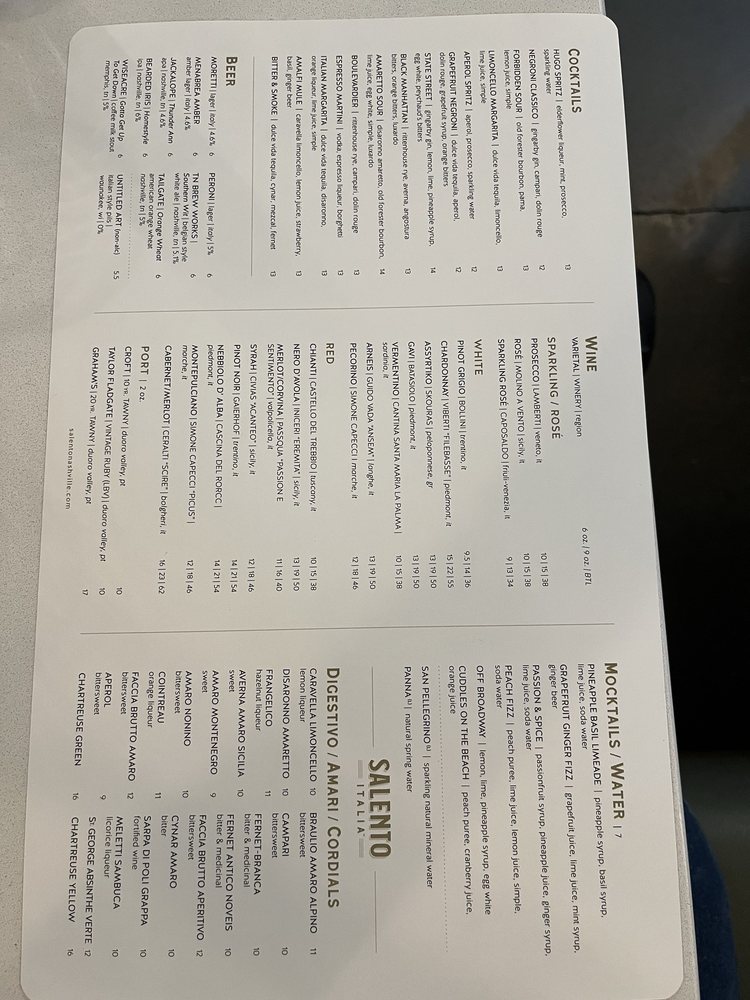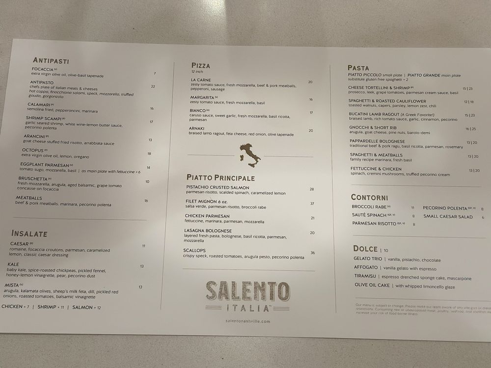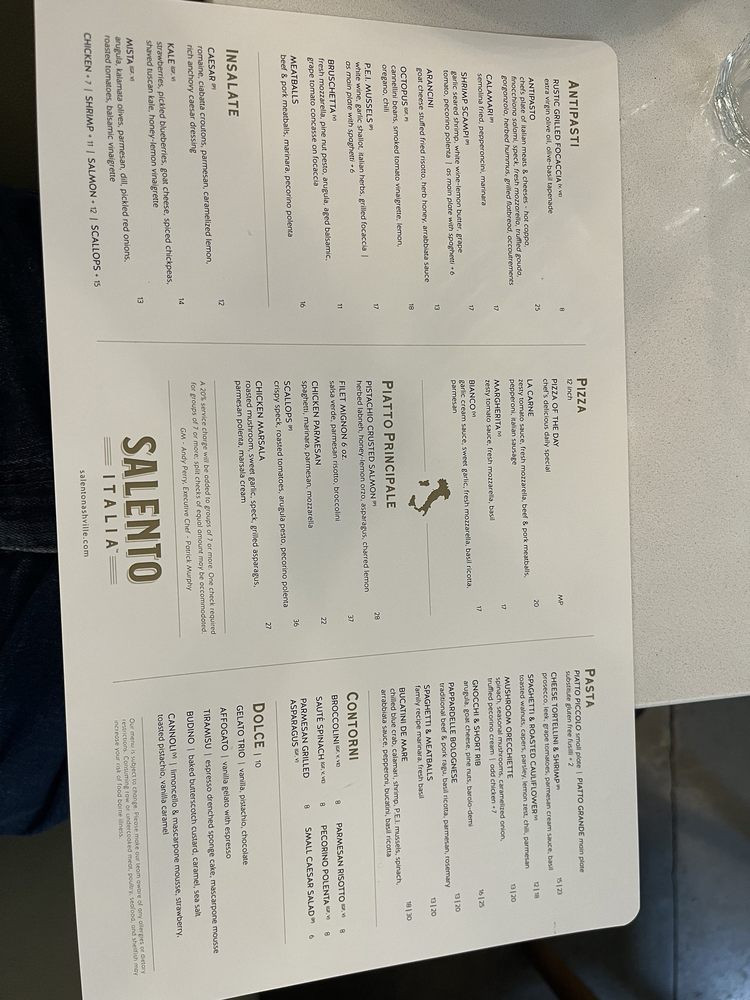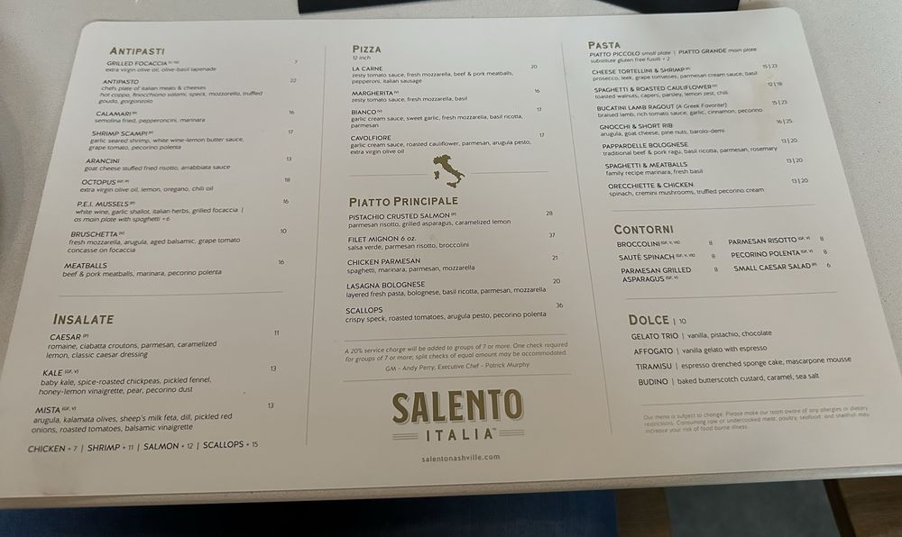 Salento Italia, located in Nashville, Tennessee, offers a trendy and intimate Italian dining experience with a variety of vegan options. The restaurant provides accessible parking, ADA-compliant facilities, and a full bar with happy hour specials. Customers rave about the delicious food and excellent service, with dishes like the shrimp tortellini, octopus starter, scallops, chicken parmigiana, and Budino dessert receiving high praise. The cozy ambiance and attentive servers add to the overall dining experience, making it a top choice for both regulars and first-time visitors. Don't miss out on their focaccia, arancini, pappardelle bolognese, margherita pizza, and tiramisu when you visit Salento Italia. Feel the upscale yet casual vibe and indulge in the fresh and flavorful offerings of this Italian gem.